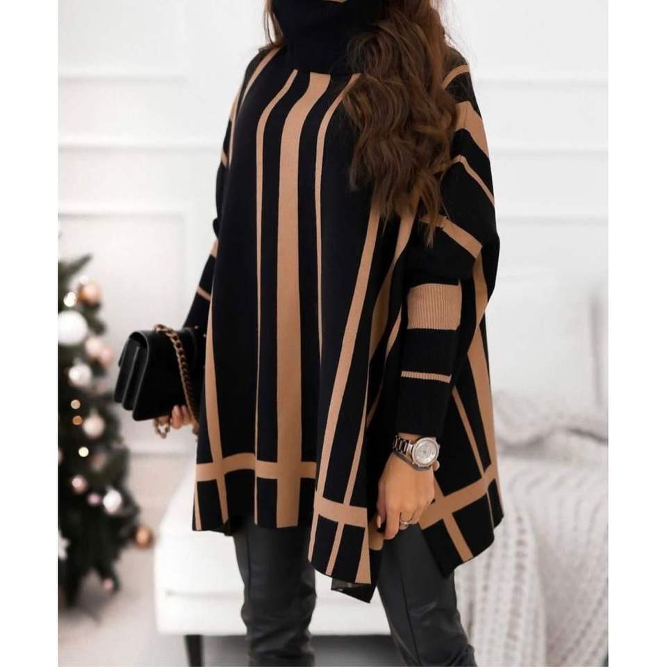 Poncho Kazakh Women's Cardigan Black Striped Knit Long Sleeve Turtleneck Sweater Outerwear Winter Fashion Coat