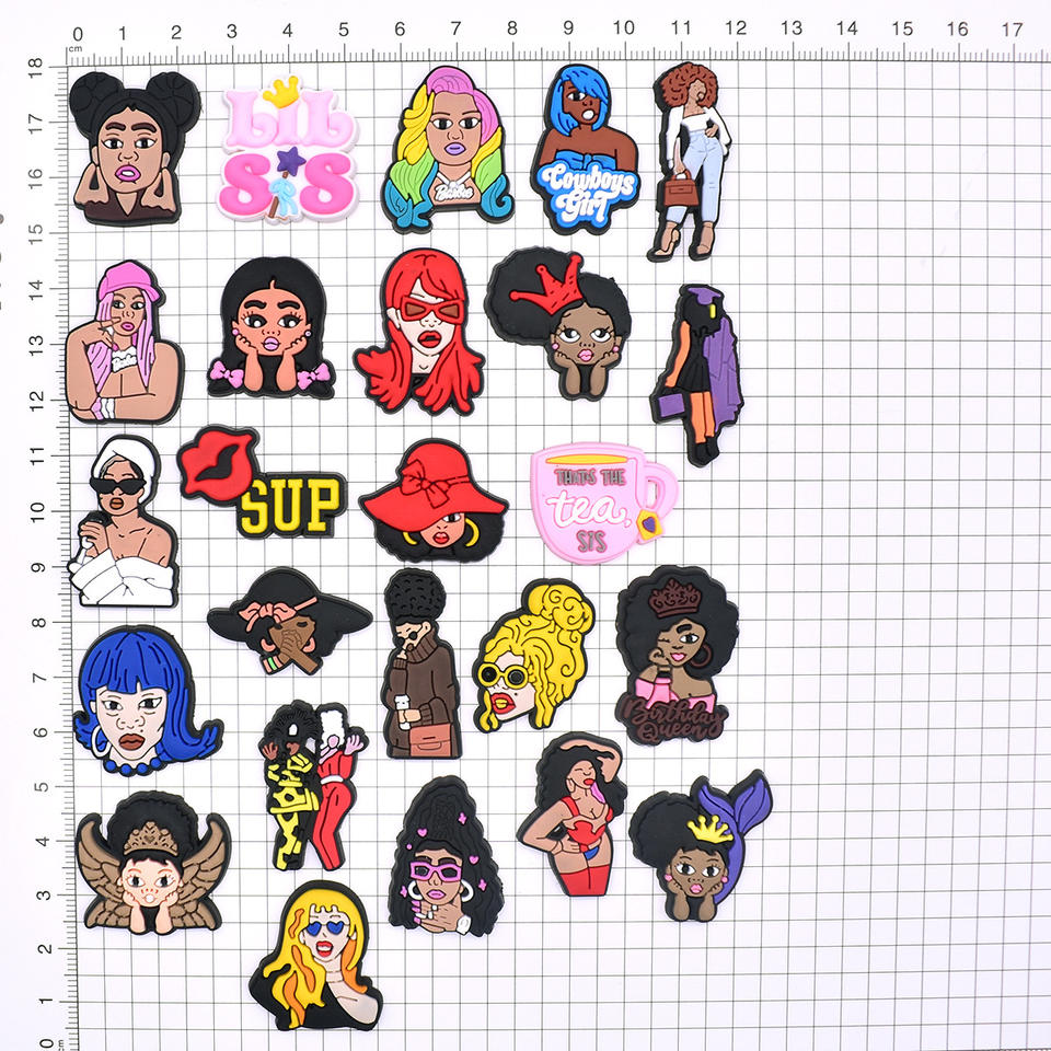 Popular Black Girls Cartoon Anime Figures Character Soft PVC Rubber 3D Garden Shoes Decoration Clog Charms