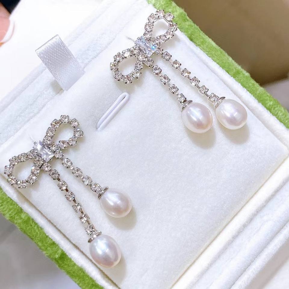 Popular Fine Dangle Earrings with Freshwater Pearl and Gemstone Inlay Bow Shaped Design Inspired by Water Droplets and Rice