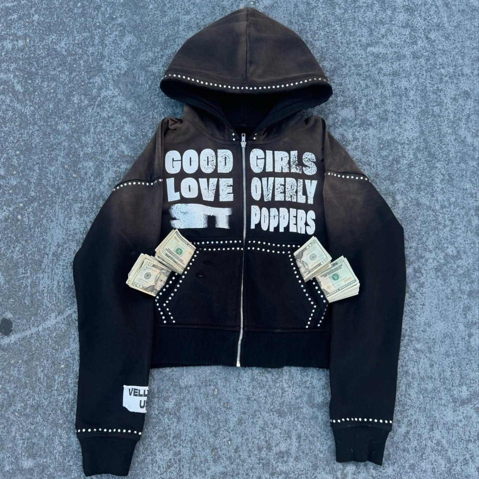 Popular Hip Hop Street Style Men's Loose Zipper up Making Old Broken Holes Rivets Design Cotton Hoodies Vintage Acid Wash Hoodie