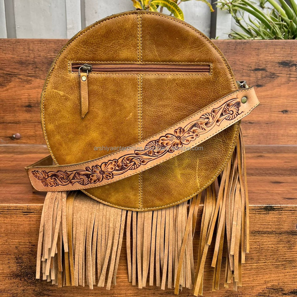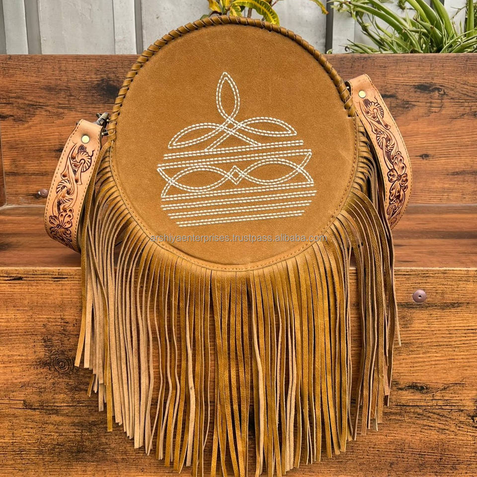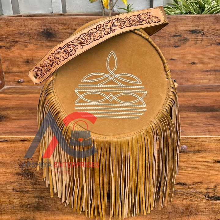Product name:Hand Tooled Suede Leather Round Fringe Bag