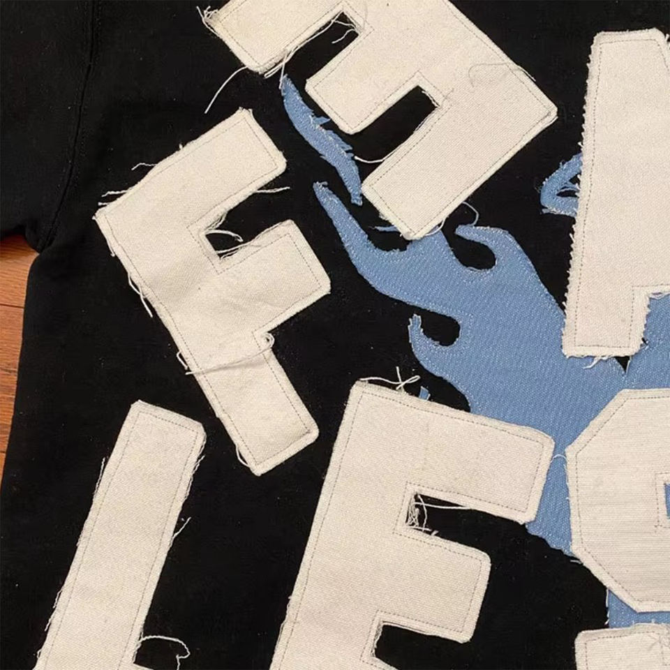 Popular Men's Oversized Black T-Shirt Fear Less Patchwork Lettering & Blue Flame Graphic Cotton Streetwear Tee For Unisex