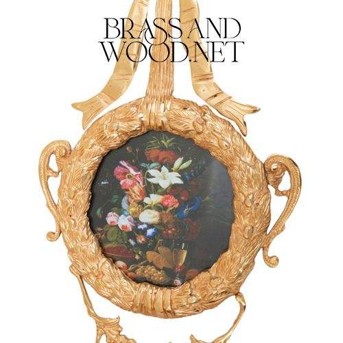 Porcelain Floral Wall Plaque in Gilded Solid Brass Frame with Ribbon Ornament
