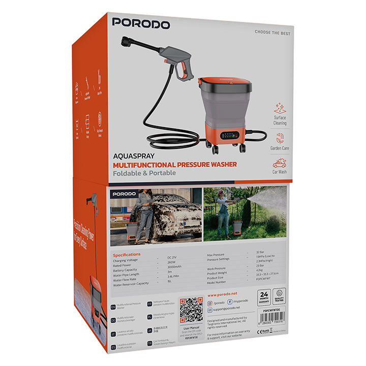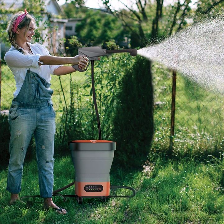 Porodo Battery-Powered 15L Water Tank Cordless Pressure Washer Adjustable Pressure Setting Foldable Portable Outdoor Cleaner Car