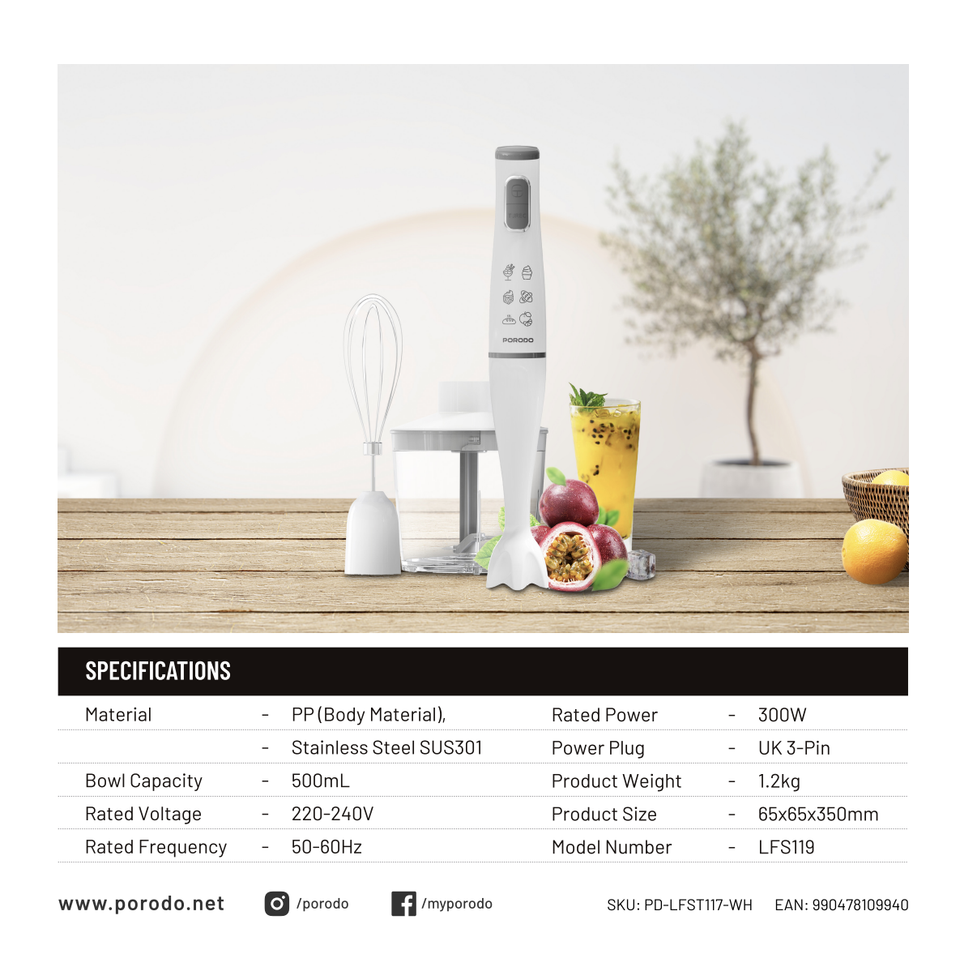 Porodo Lifestyle Powerful Hand Blender Food Chopper & Whisker