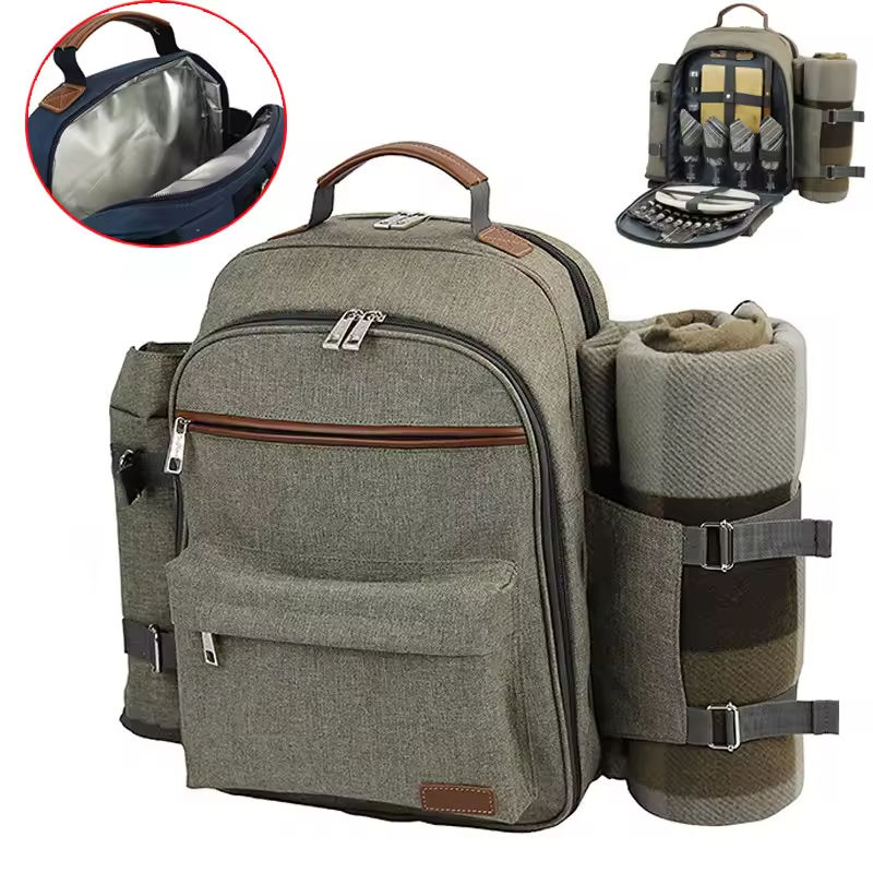 Portable 10L Picnic Backpack Set for 4 People Includes Insulated Cooler Wine Pouch Blanket Family/Couples for Climbing Polyester