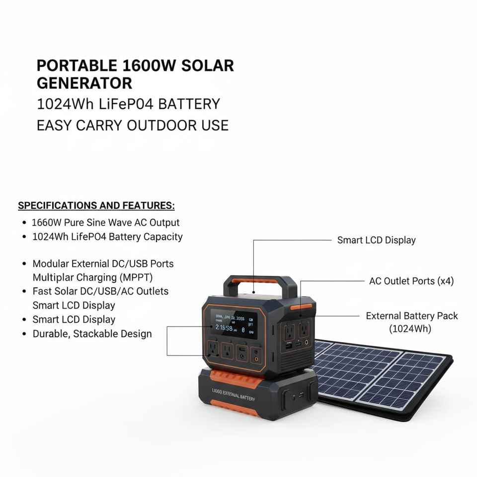 Portable 1600W 1024Wh LiFePO4 Solar Power Station Pure Sine Wave Inverter Easy Carry Camping Travel Emergency Power OEM Brand