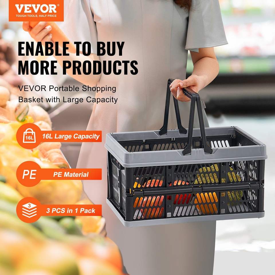 Portable 16L Foldable Shopping Basket with Handle 3PCS Set for Grocery Shopping