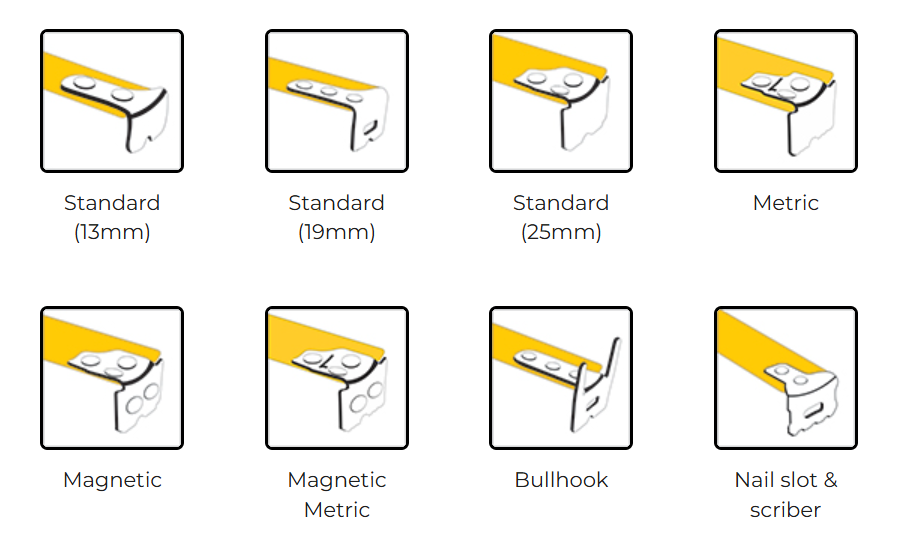 Standard, Magnetic, Bullhook, Nail slot and scriber