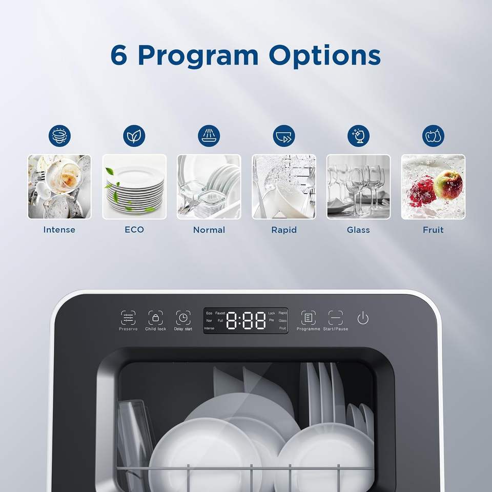 Portable Countertop Dishwasher, 7L Detachable Water Tank, 6 Programs, No Hookup Needed, Hybrid Drying & Preserve Function