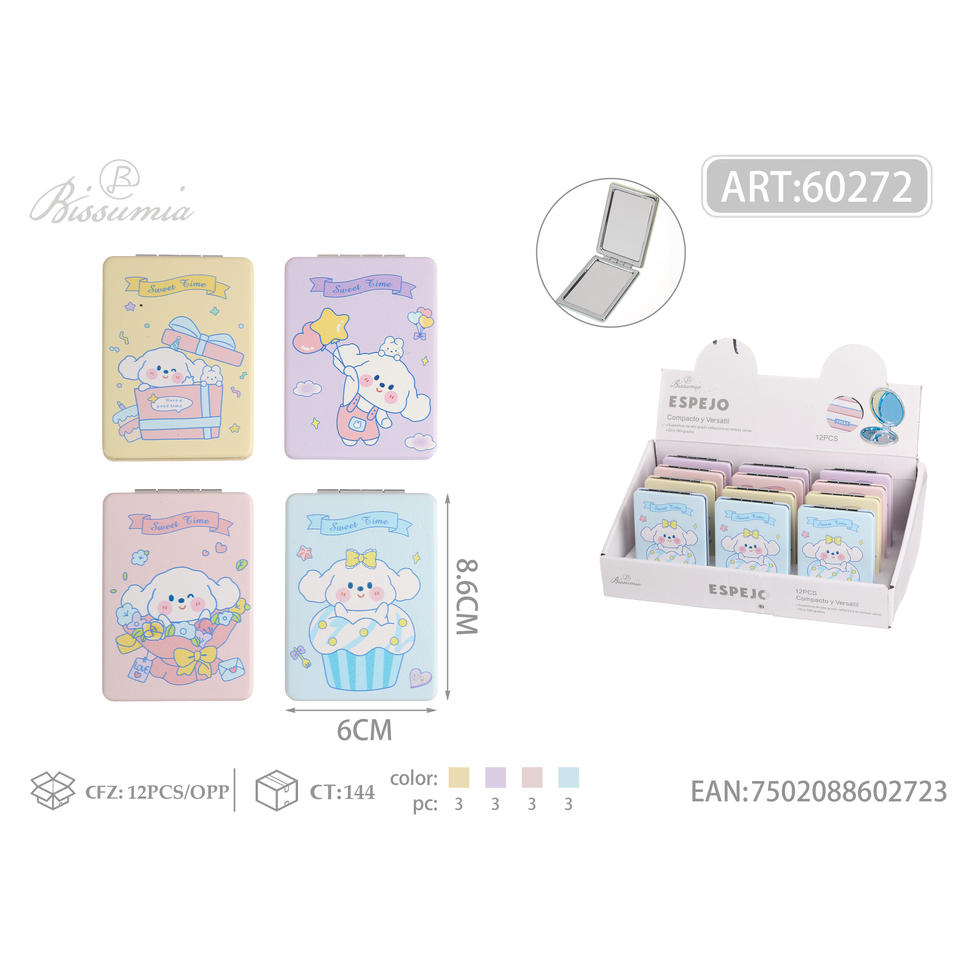 Portable Double-Sided 6*8.6 Puppy Square Cosmetic Mirror Stainless Steel Finish Foldable Handheld Small Cap 1x Crystal