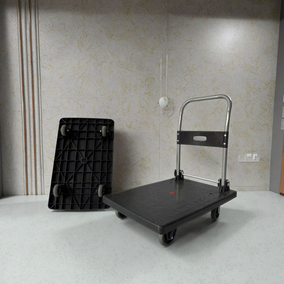 Portable Heavy Duty 150kg Industrial Plastic Platform Hand Cart Trolley Blue 65*40cm with Four-Wheel OEM Customizable