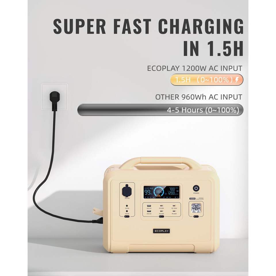 Portable Power Station with 960Wh LiFePO4 Battery Backup 1.5H Fully Charged 1200W Solar Generator 4 AC Outlets