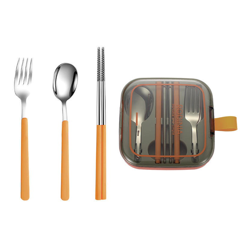 Portable Stainless Steel Cutlery Set With Spoon Fork Chopsticks For Camping Students Outdoor Use Rectangular Design Plastic Lid