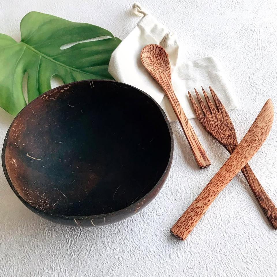 Portable cutlery travel set with coconut fork and spoon wholesale coco wood utensils for outdoor campsites