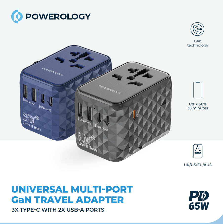 Powerology Universal 65W PD GaN Travel Adapter 3x Type-C and 2x USB-A Ports 3-in-1 Wireless Charging Station
