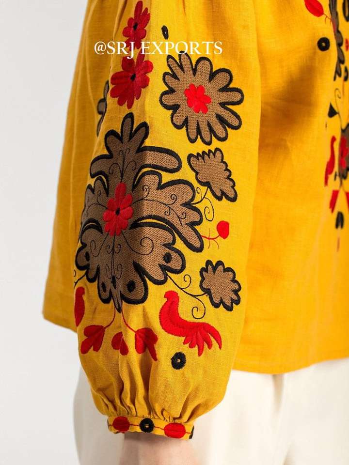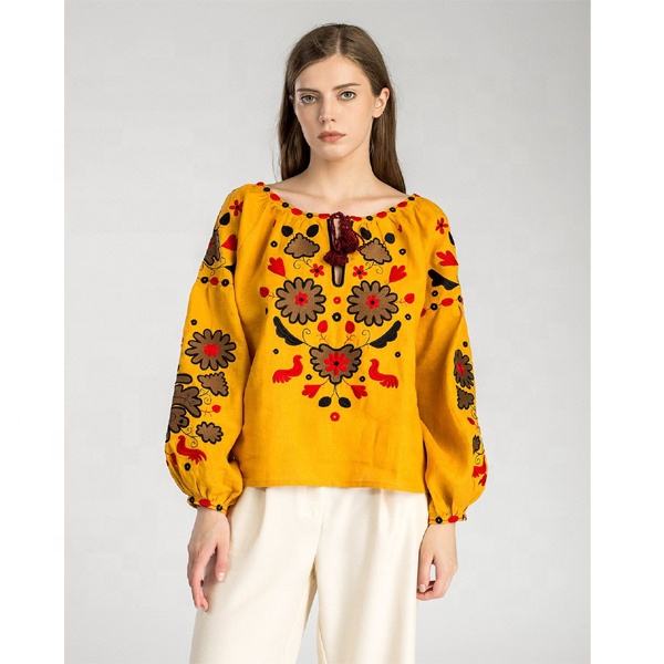 Precious Elegant Women Tops Ukrainian Linen Lace Tassel O-Neck Women Blouse Yellow Ethnic Motives Colorful Embroidered Natural