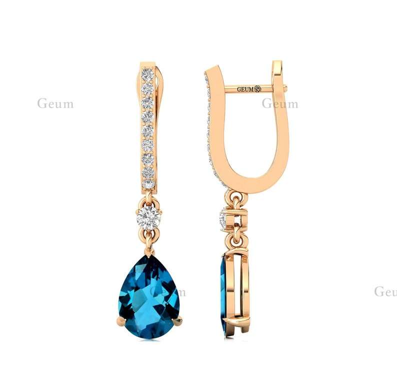 Precious High Quality London Blue Topaz Gemstone 18k Solid Gold Handmade Dangle Drop Earrings With Real IGI Certified Diamonds