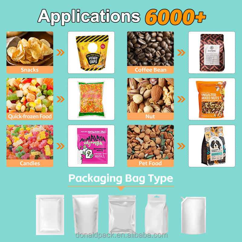 Bags, Stand-up Pouch, Cartons, Cans, Bottles, Barrel, Film, Foil, Belt, Pouch, Case, gusseted pillow bag, 3 sides sealing bag, 4 side seal bagpackaging type