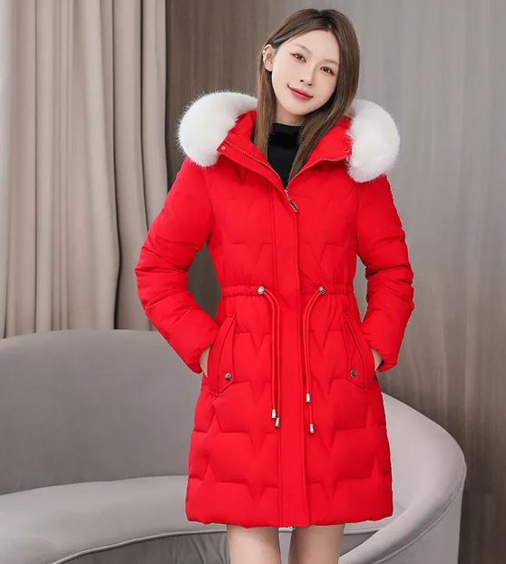 Premier Womens Luxury Long Quilted Winter Coat Elegant Black Warm Overcoat with Plush Faux Fur Hood High End Fashion Design