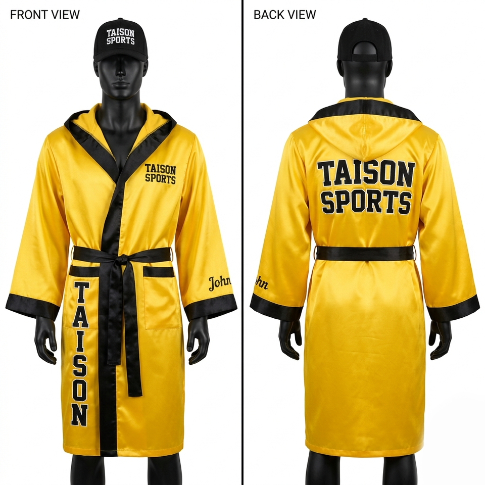Premium 220 GSM Satin Boxing Robe Black Red Gold Panel Design Custom Embroidery Logo Hooded Belted
