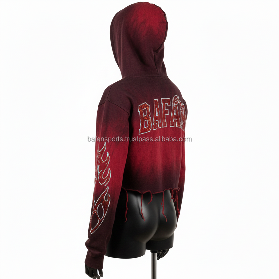 Premium 300 GSM Cotton Blend Women Crop Top Hoodie Ombre Red Black Fabric With Rhinestone Logo Flame Sleeve Raw Hem Customizable