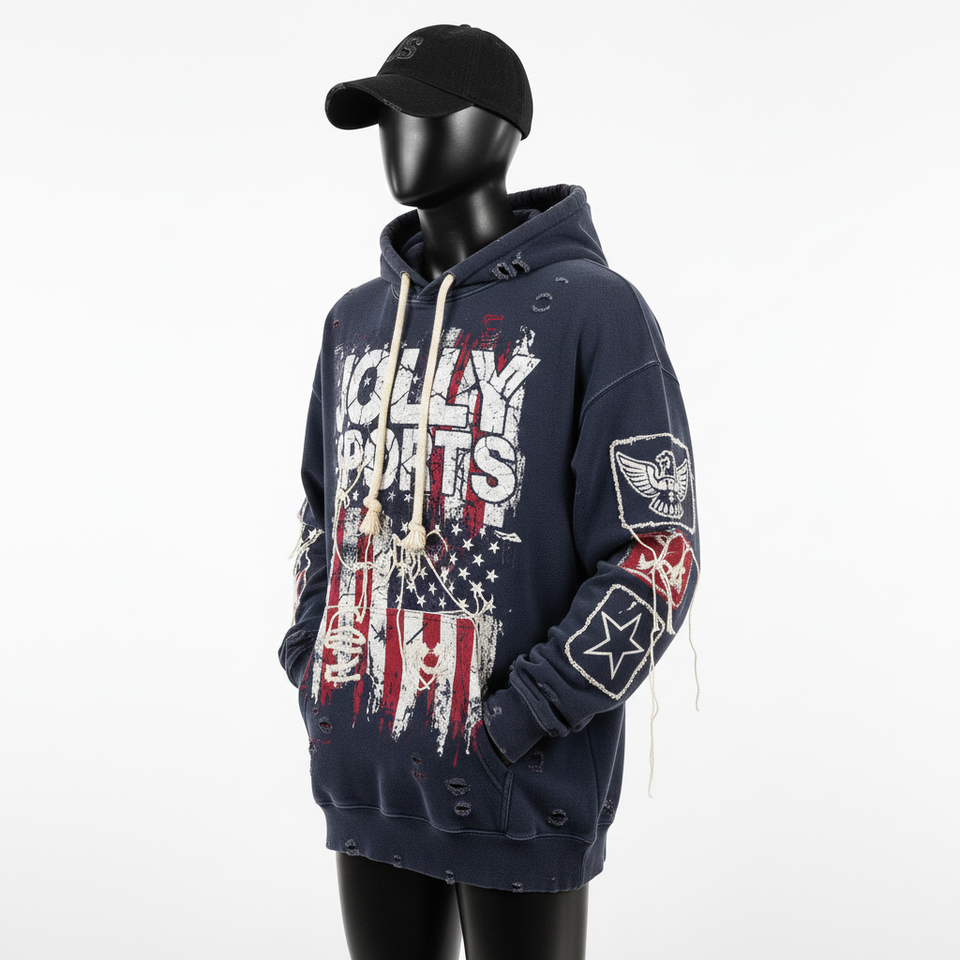 Premium 320 GSM Cotton Fleece Men Pullover Hoodie Navy Red Distressed Print Patch Panels Custom Logo Screen Print Basics Hoodie