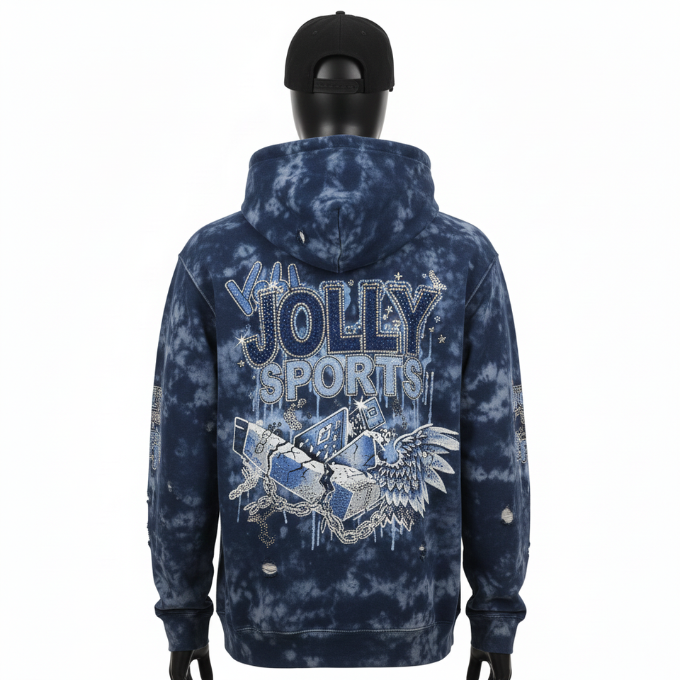 Premium 320 GSM Men Tie Dye Hoodie Soft Cotton Fleece Fabric Distressed Style Blue Shades Custom Rhinestone Logo Basics Hoodie
