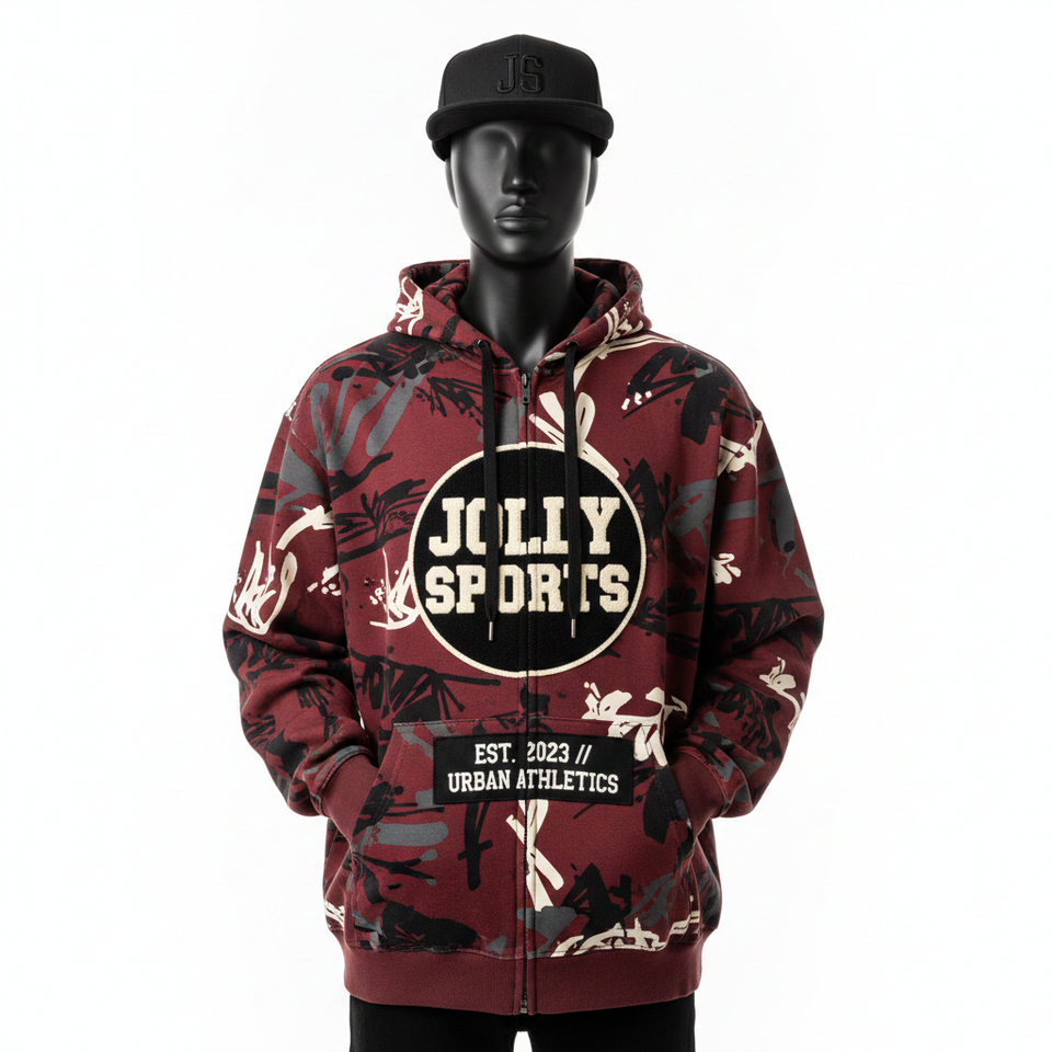 Premium 330 GSM Fleece Zipper Hoodie Urban Camouflage Maroon Black Full Zip with Custom Embroidery Logo Basics Zipper Hoodie