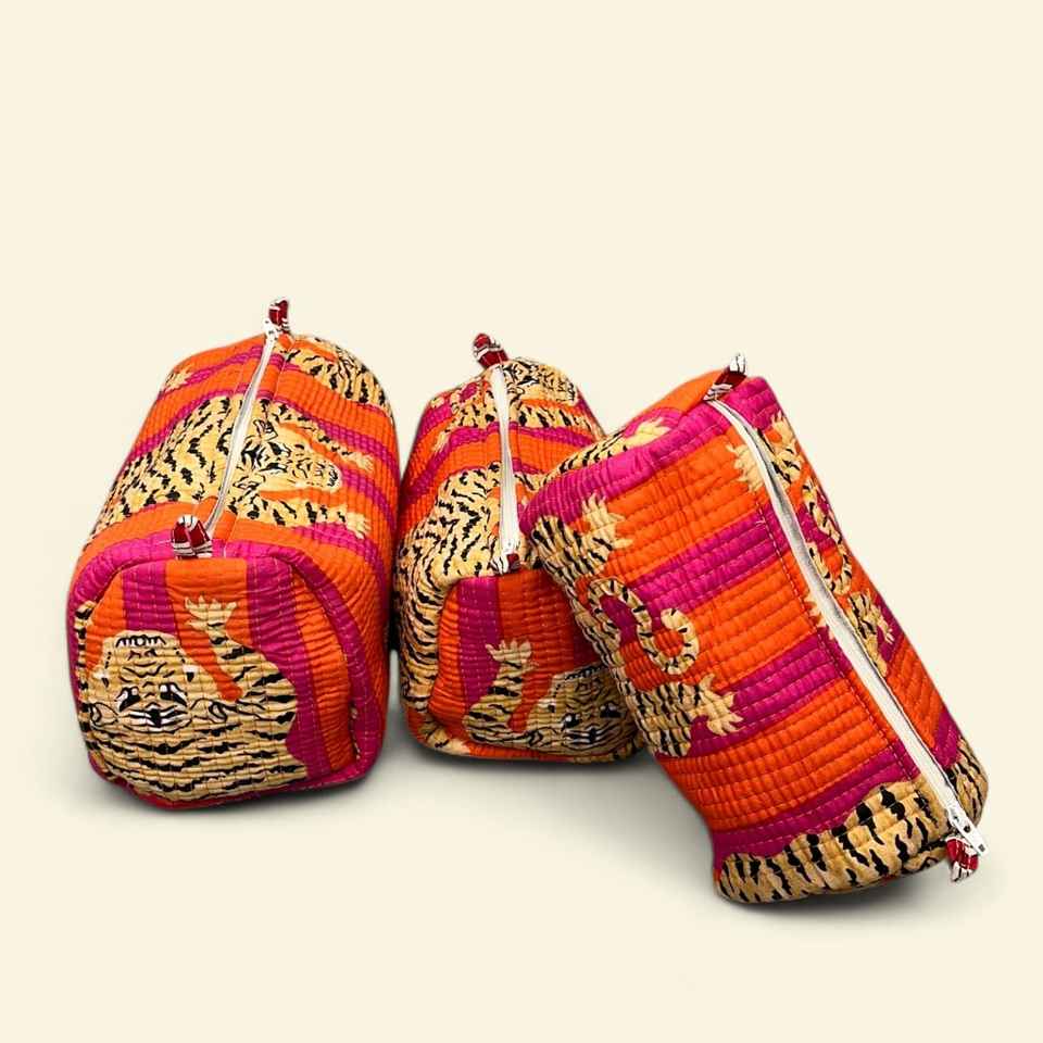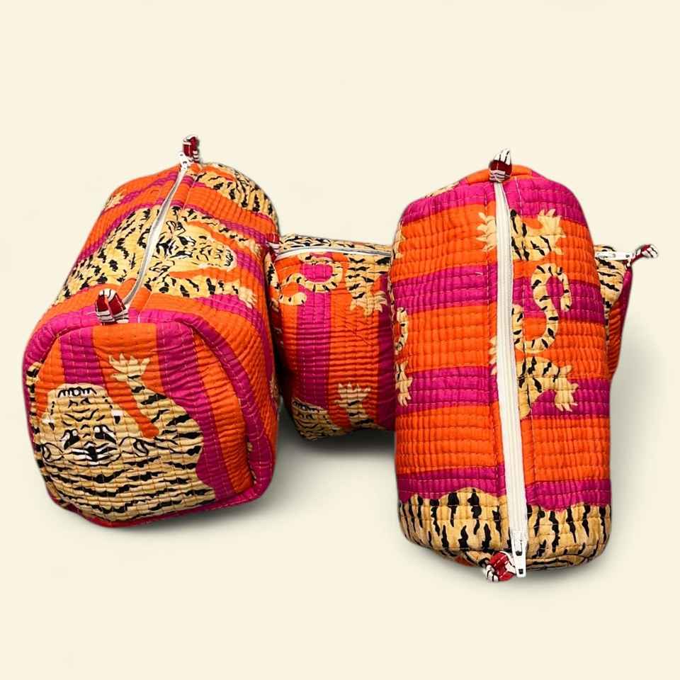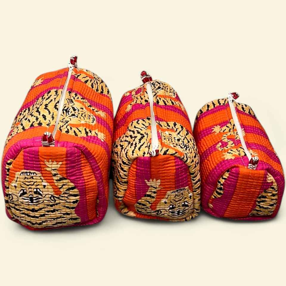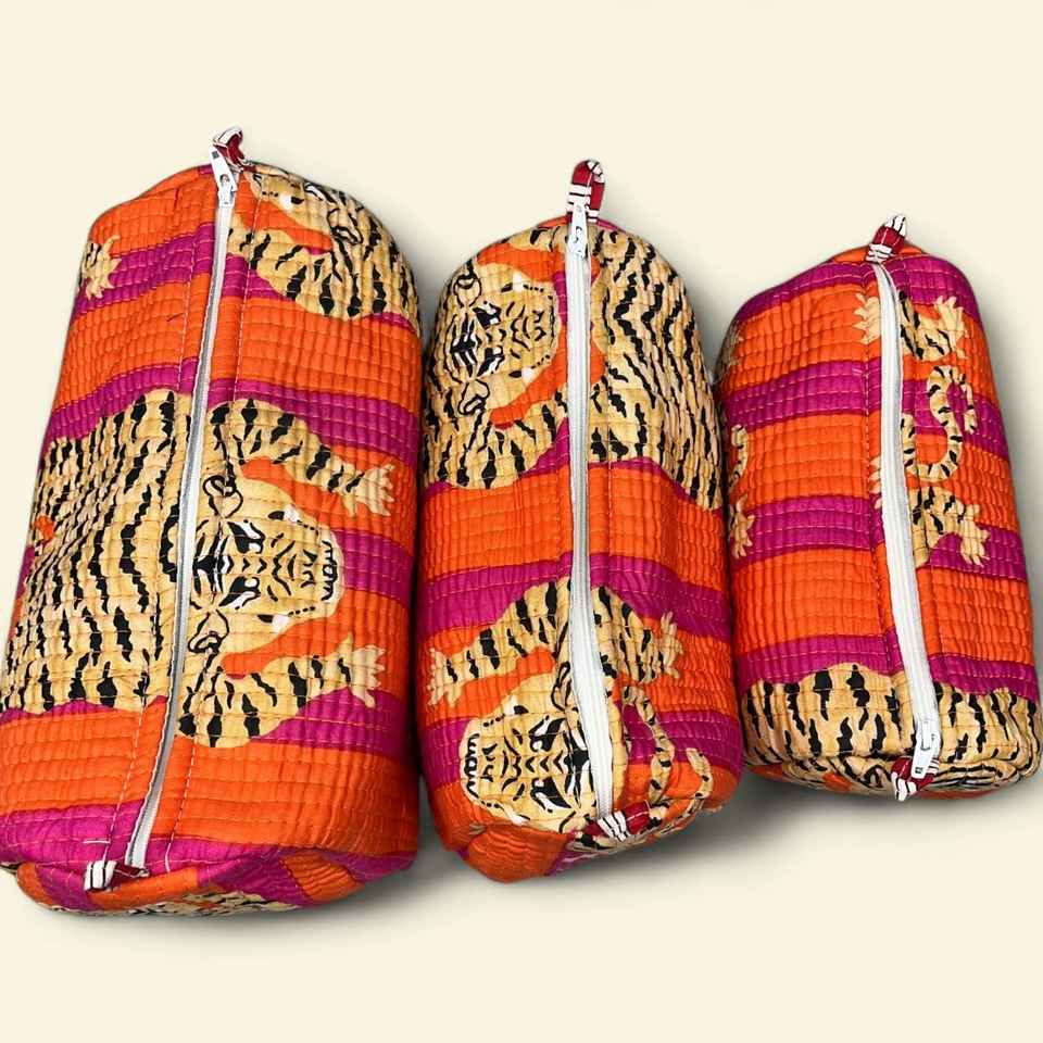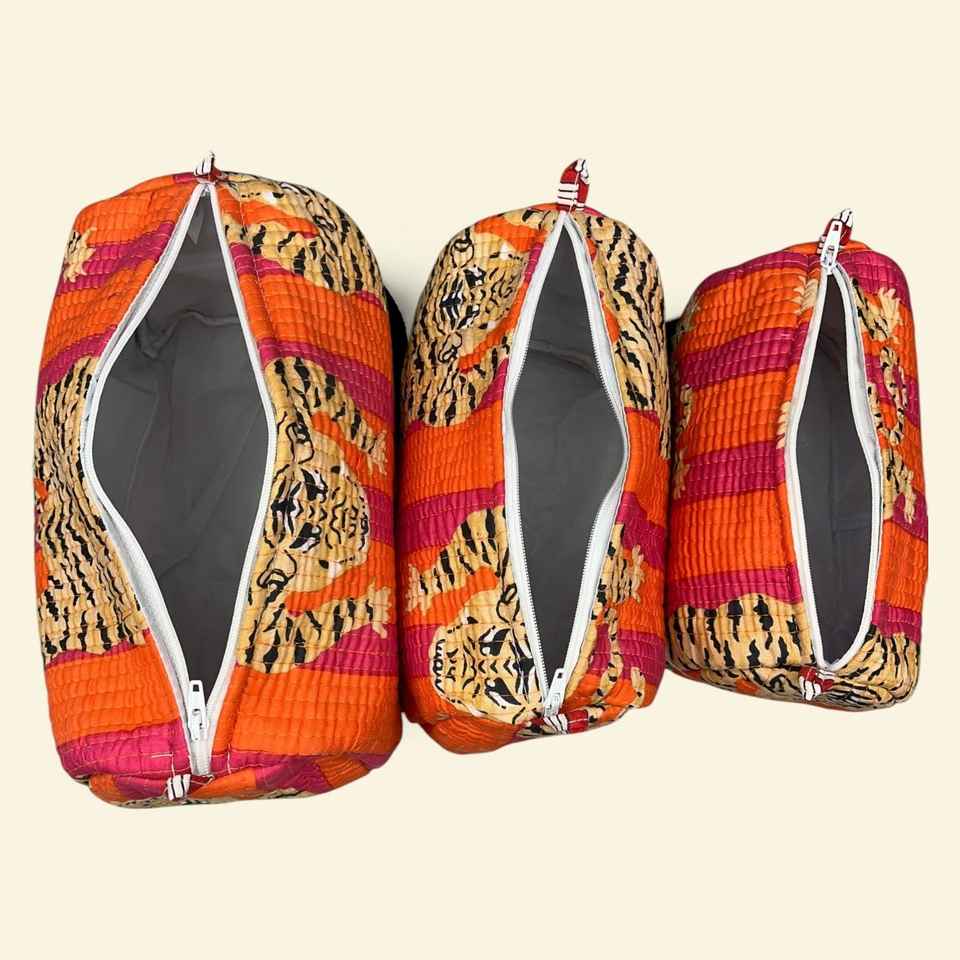 Premium 3Pcs Waterproof Quilted Cotton Cosmetic Bag Set Fixed Zipper Jungle Print Travel Makeup Pouch