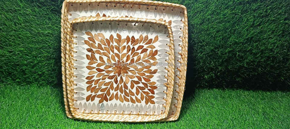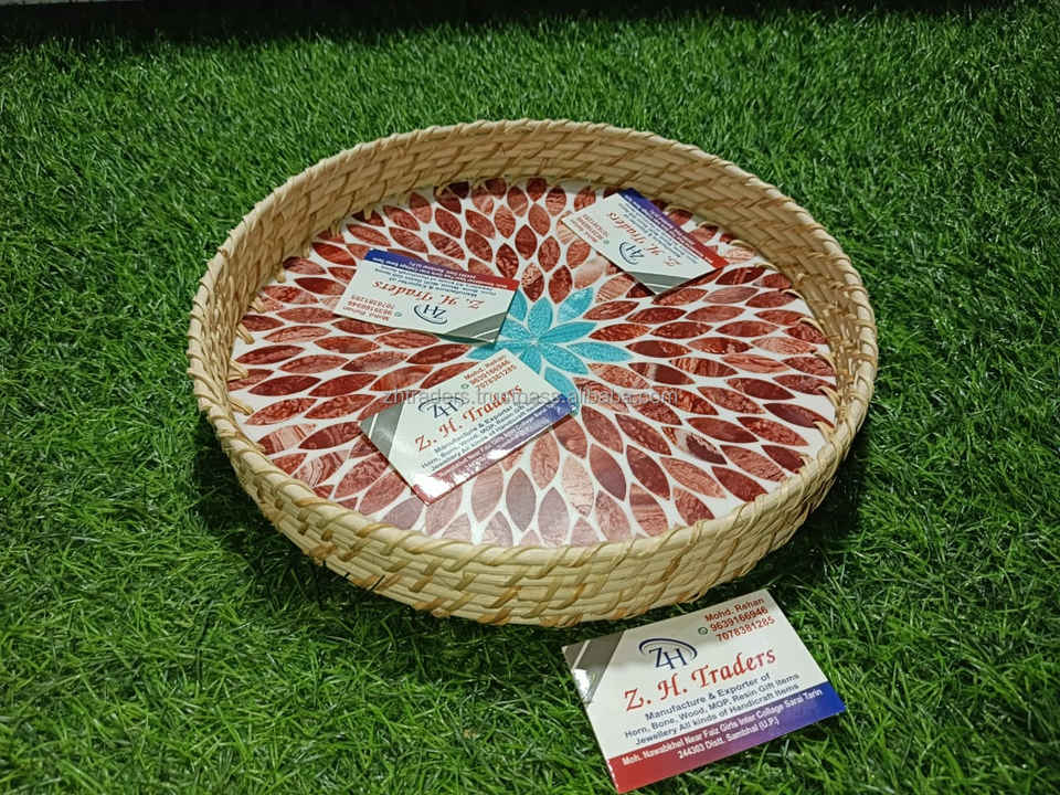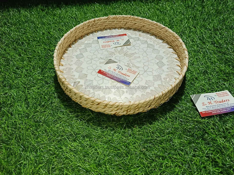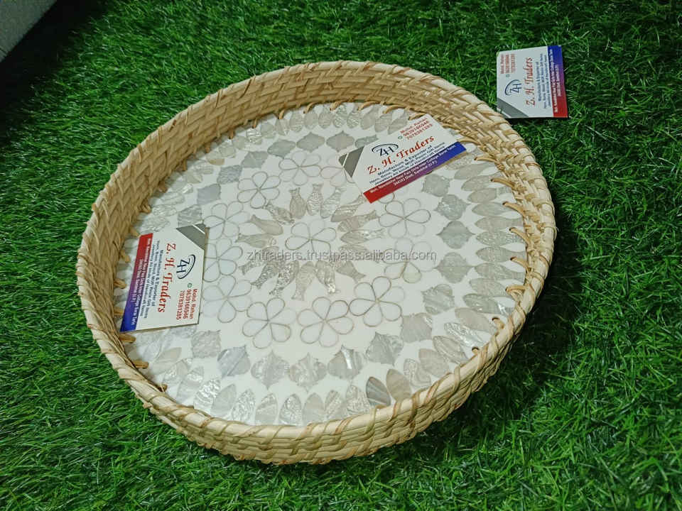 Premium Affordable Mother of Pearl Inlay Round Rattan Tray Set Handmade Design for Dining, Kitchen and Ramadan Presentation
