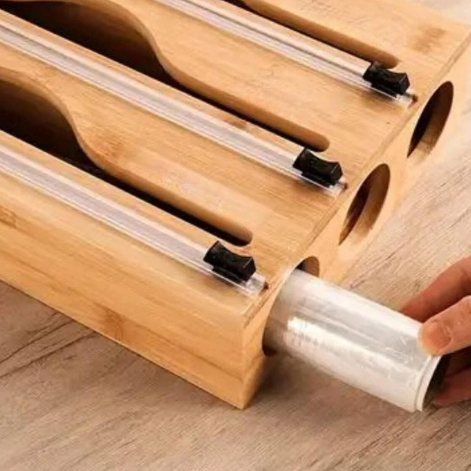 Premium Modern Bamboo 3-in-1 Wrap Dispenser with Slide Cutter for Foil and Film Standing