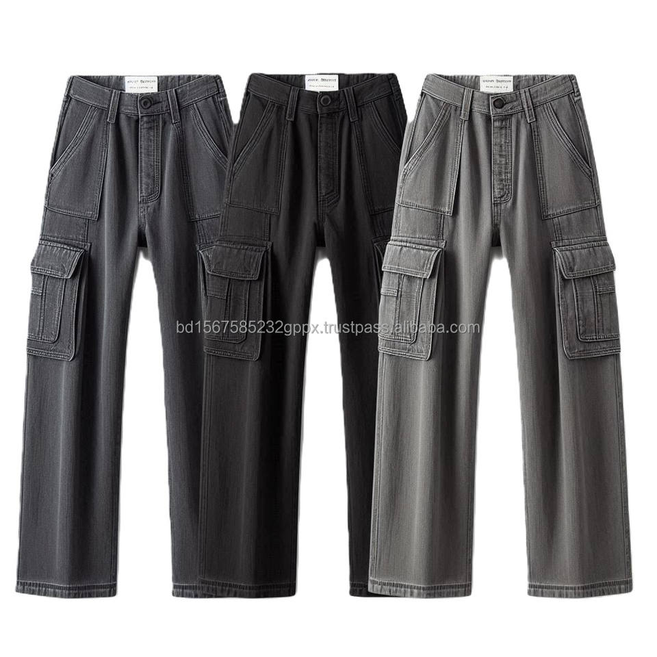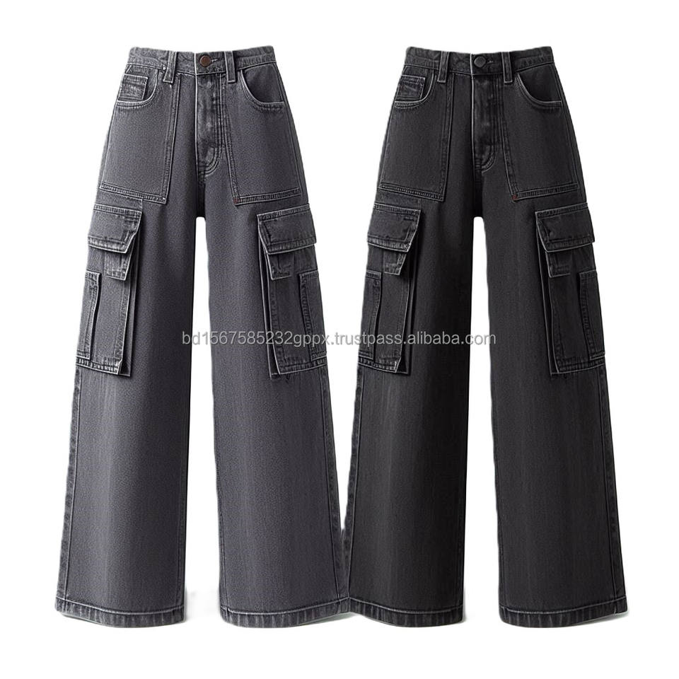 Premium Black Gray Denim Cargo Jean Pants for Women Wide Leg Comfortable Fit Solid Casual Streetwear Custom OEM ODM Wholesale