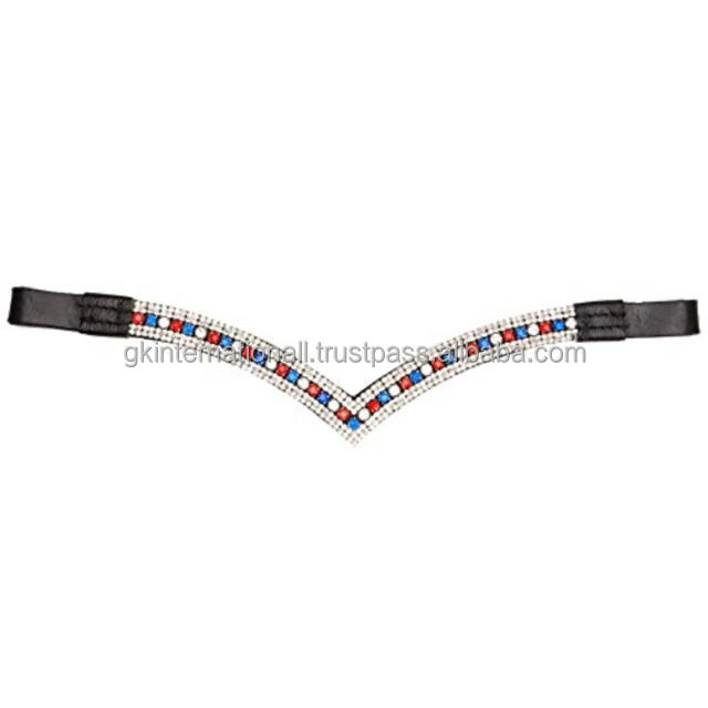 Premium Black and Havana Brown Saddle Leather Horse brow band with colorful tiny crystals stones mega bling brow band