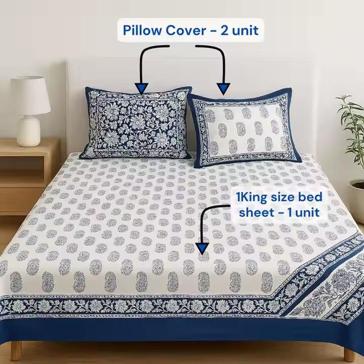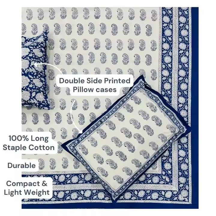 Premium Boho Indian Paisley Motif Hand Block Printed Unique Indian Print Blue Pure Cotton Bed Sheet Set King Size Bedding
