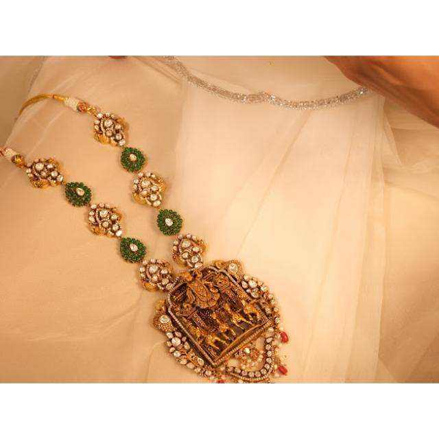 Premium Brass Temple Jewellery Set With Pearl Studded Ancient Kundan Design For Women Bridal Wedding Wear