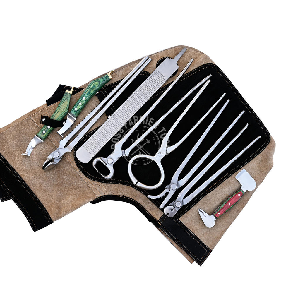 Premium Brown Leather Farrier Kit Hoof Nipper Curved Clincher Nail Puller Pain Tester for Sensitive Hoof Sharpe Trimming Knife