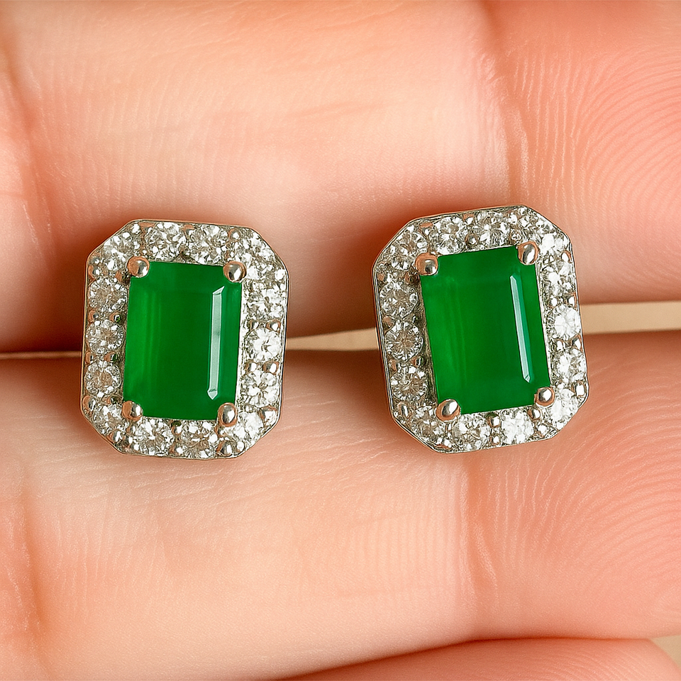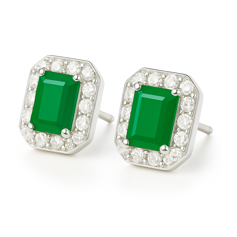 Premium Children's Rhodium Plated Green Onyx Emerald Cut Halo Stud Earrings in Sterling Silver for Wedding Engagement Gift