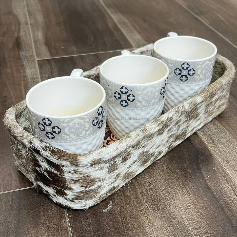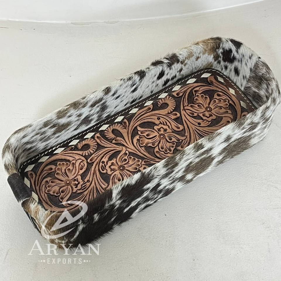Premium Design Western Hand Tooled Leather Hair On Cowhide Tray Handmade Decorative Storage Holder for Keys Wallet Jewelry Items