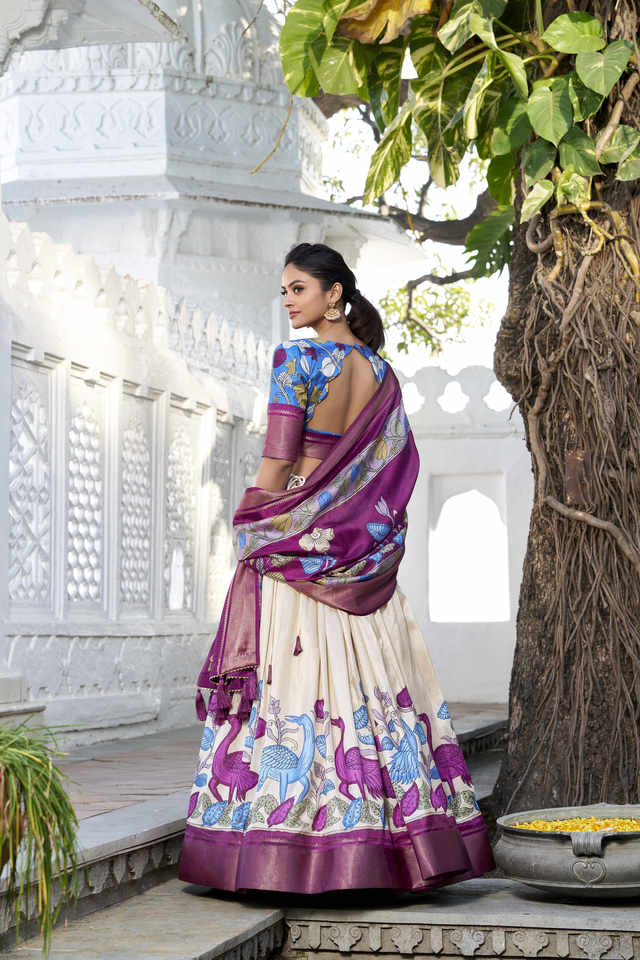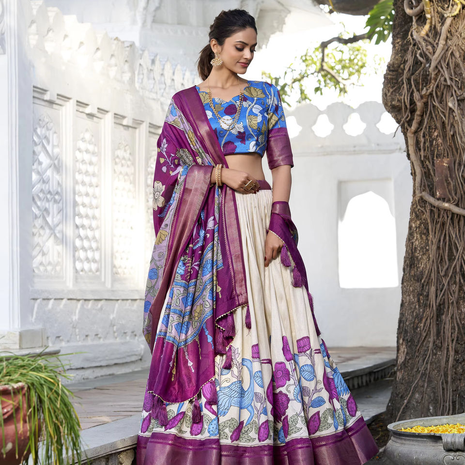 Lehenga Work:Printed (Kalamkari) With Zari Weaving Border