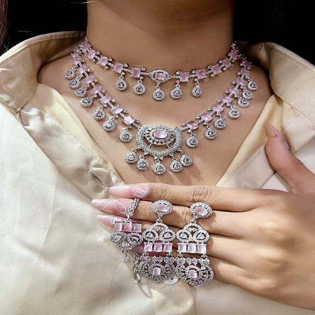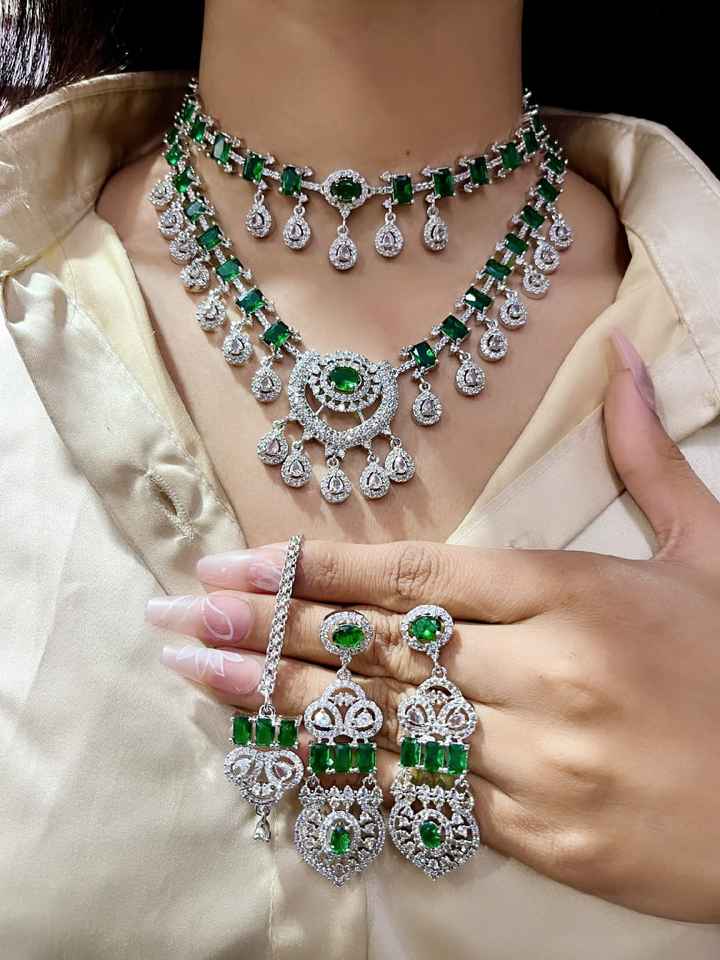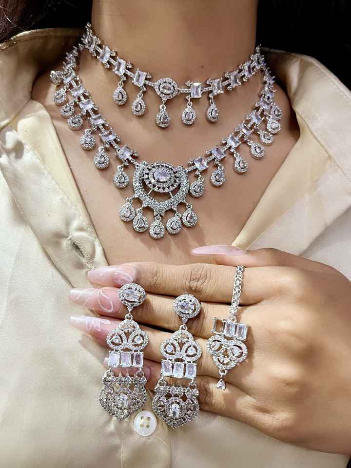 Premium Double Layer Necklace Set with Long Earrings And Maang Tikka Star Cut American Diamond Perfect For Wedding, Party Wear