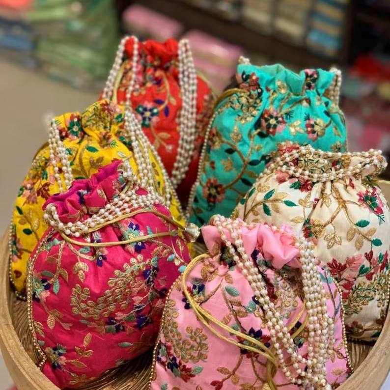 Premium Embroidered Indian Potli Bag with Pearl Handle | Bridal Wedding Potli | Ethnic Drawstring Gift Bag Festive Party Clutch