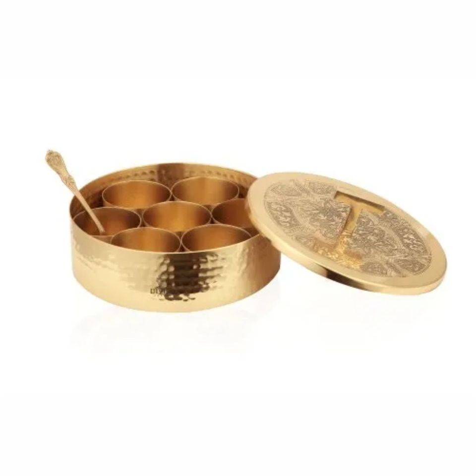 Premium Engraved Brass Spice Box (Masala Dabba) with 7 Compartments and Hammered Finish for Kitchen Storage Metal Spices Box
