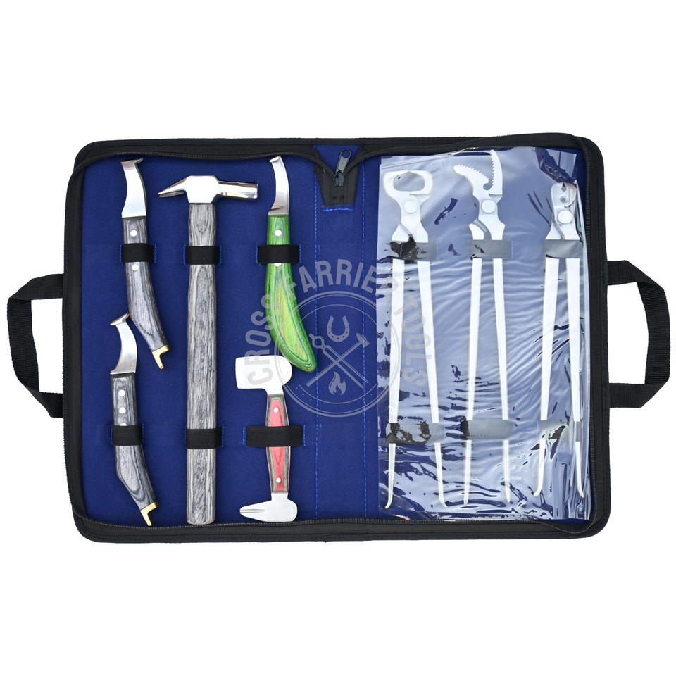 Premium Farrier Tools 12in Puller, Clincher, Sharpe Nipper, Shoeing Hammer wooden handle Loop Blade Knife & Dual side Buffer