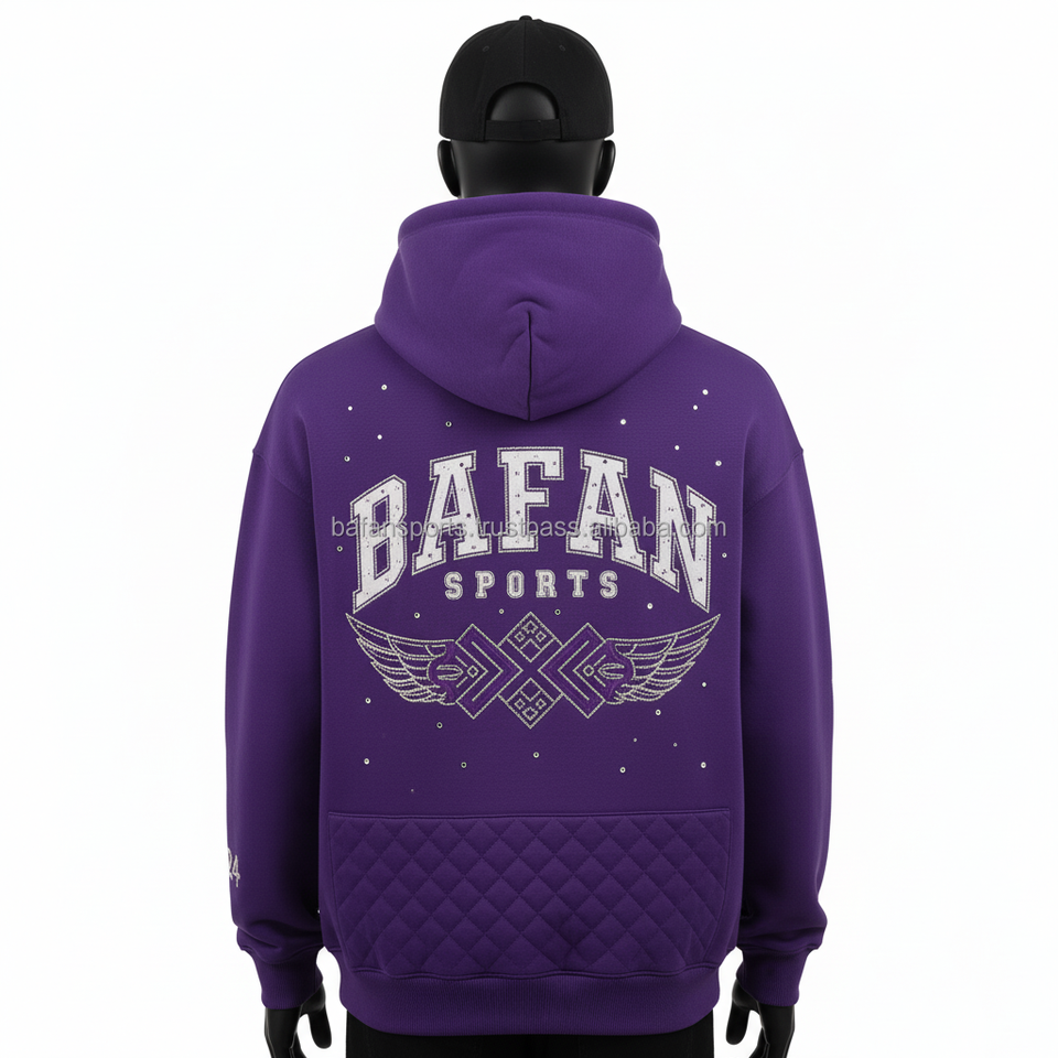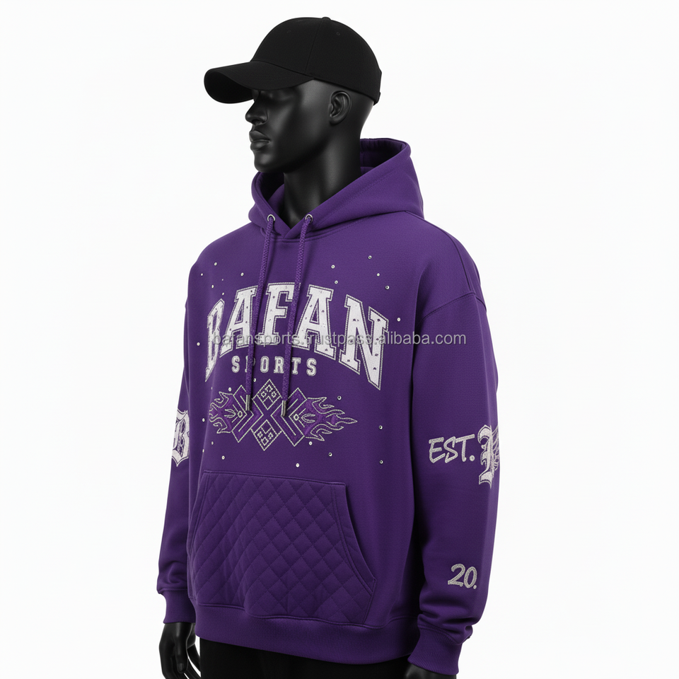 Premium Fleece Pullover Hoodie with Soft Cotton Blend Quilted Front Purple Color Custom Logo Rhinestone Embroidery basics Hoodie