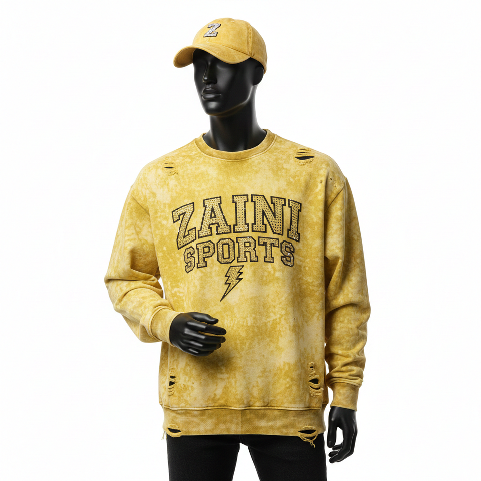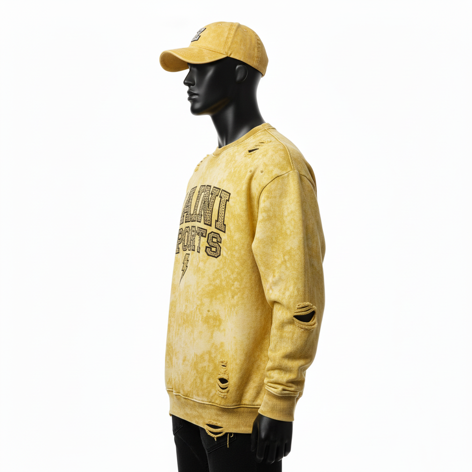 Premium Fleece Sweatshirt 320 GSM Soft Cotton Tie Dye Yellow Distressed Style Custom Embroidery Logo Basics Sweatshirts