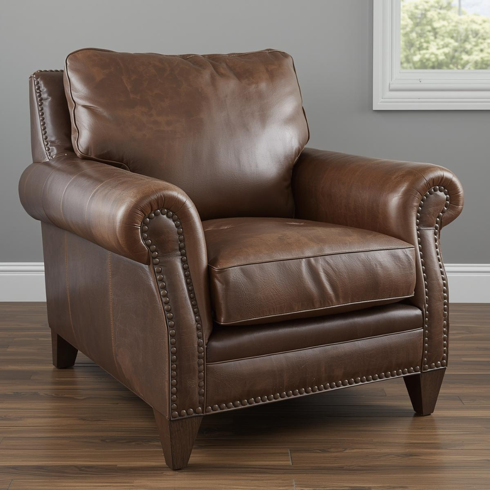 Premium Genuine Leather Arm Chair Comfortable Upholstered Accent Sofa Rolled Arms Nailhead Trim for Living Room Home Seating