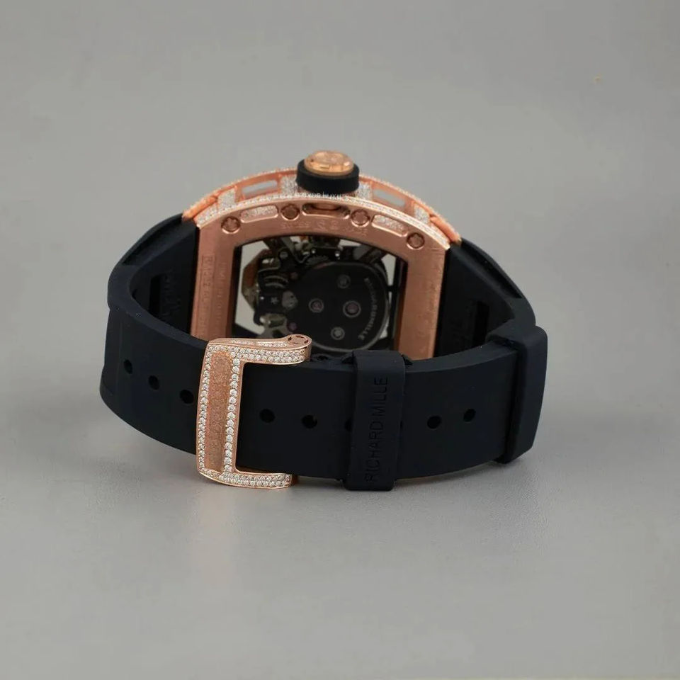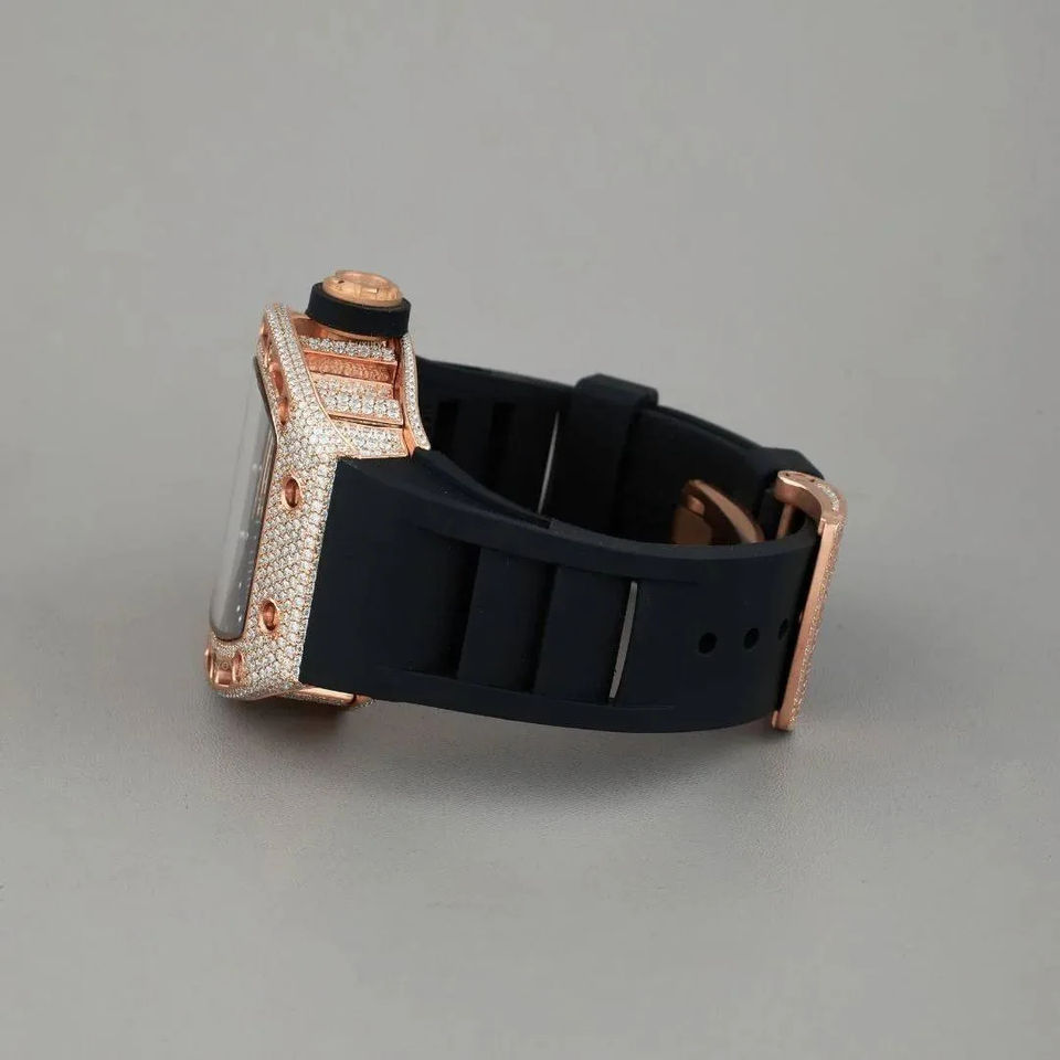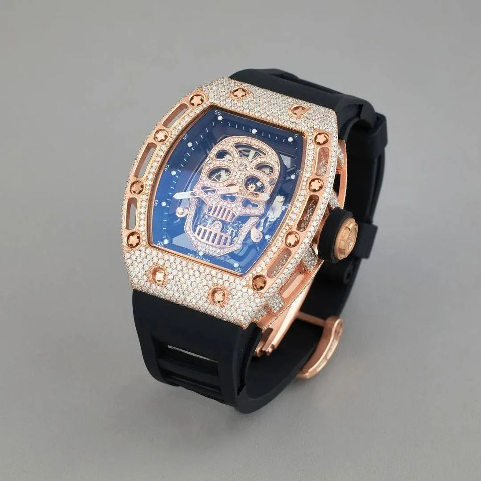 Premium Gold Luxury Rose Gold Iced Out Moissanite Skull Skeleton Watch with Black Rubber Strap Hip Hop Custom Watch