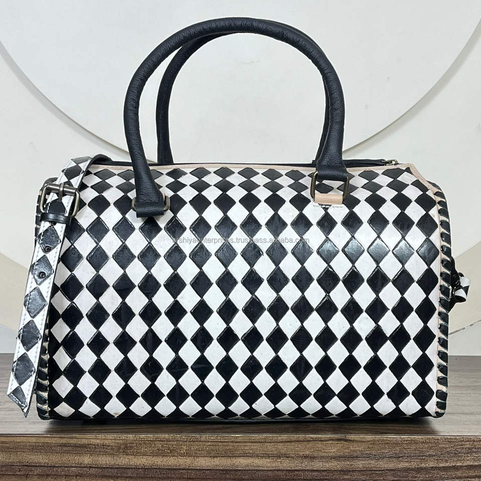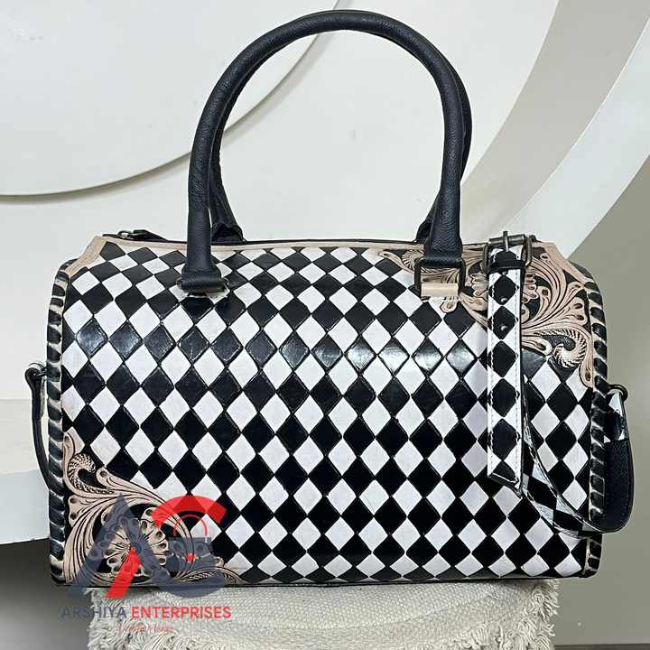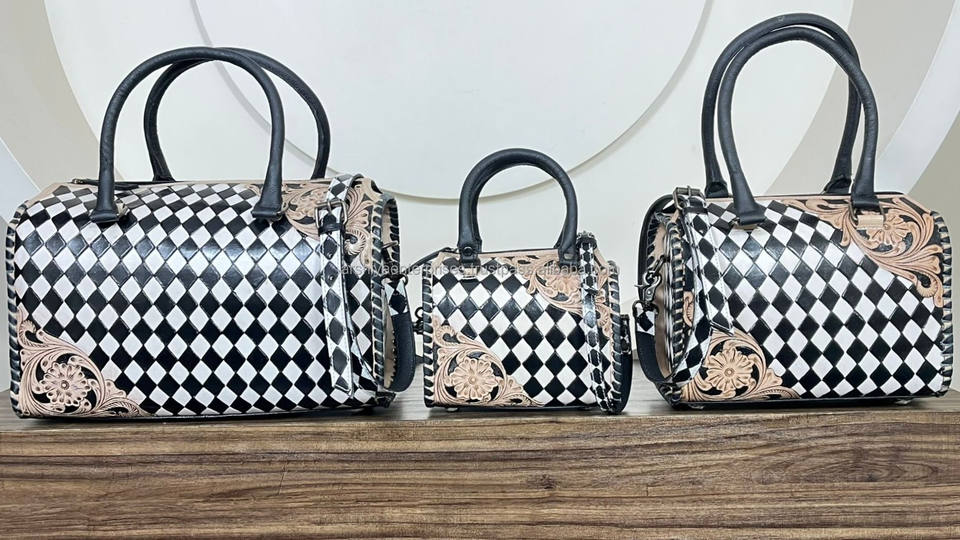 Premium Hand-Tooled Cow Leather Speedy Duffel Bag Western Black & White Checkered Large Shoulder Handbags for Travel & Daily Use
