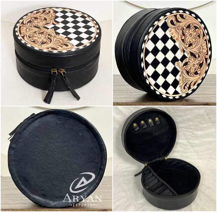 Premium Hand Tooled Genuine Cowhide Leather Round jewelry Storage Box With Checkered Pattern Floral Design Perfect for Women's